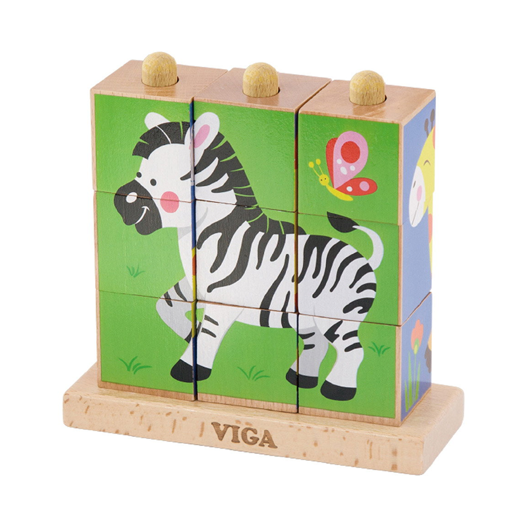 Puzzle din lemn cu 9 cuburi ce pot forma imagini cu 4 animale, Viga