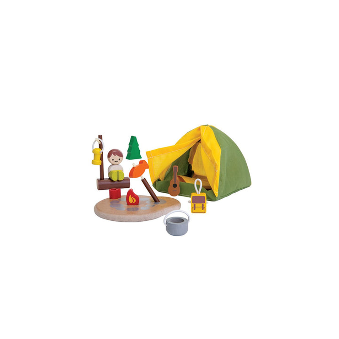 Set de camping cu 15 piese din lemn și textil, Plan Toys - Jucărie Montessori